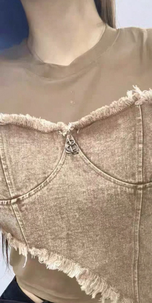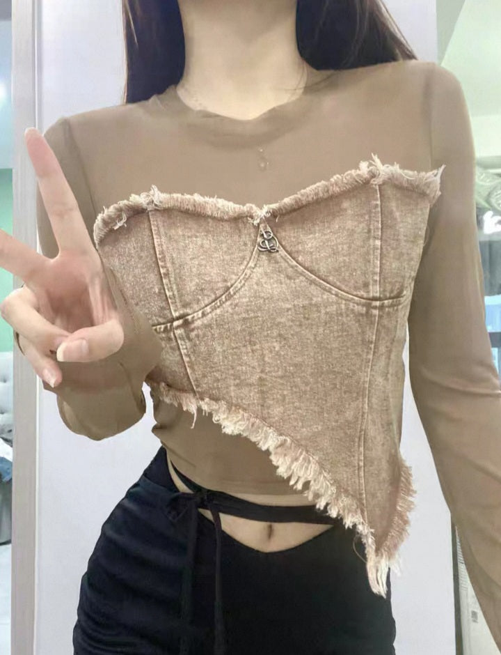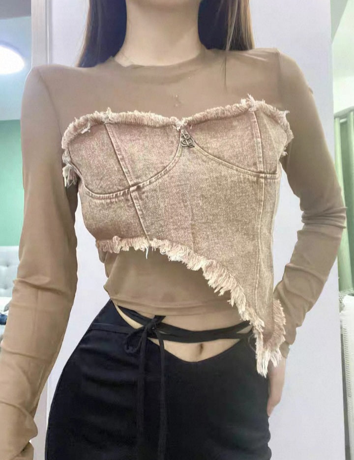 Affichez une allure audacieuse avec ce haut à manches longues en maille transparente , orné d'un bustier en denim audacieux aux détails effilochés. Le contraste entre la maille délicate et le denim brut crée une pièce remarquable et avant-gardiste, parfaite à superposer ou à porter seule. Son ourlet asymétrique apporte une touche d'originalité, tandis que sa coupe ajustée flatte votre silhouette.