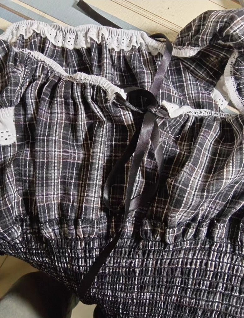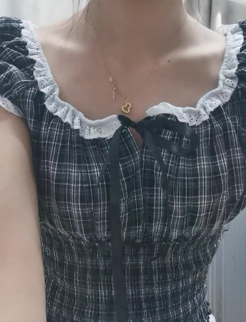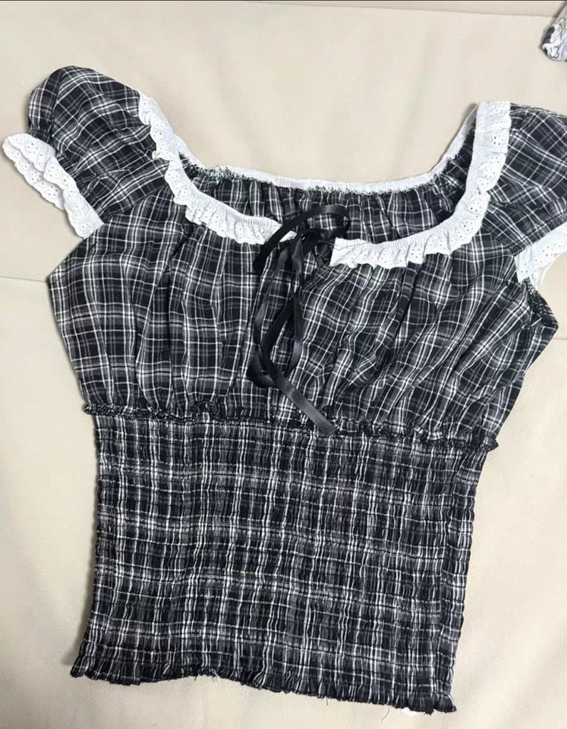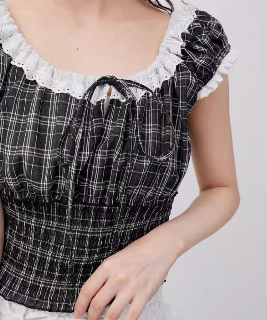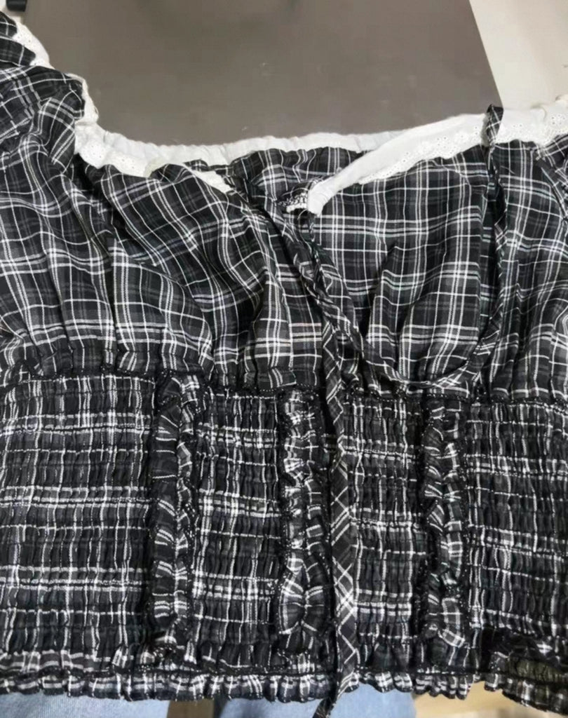 Apportez une touche de charme vintage à votre garde-robe avec ce haut court à carreaux smockés, disponible en deux coloris : beige doux et noir classique. Orné d'une délicate bordure en dentelle et d'un nœud délicat, ce haut allie à la perfection esthétique rétro et confort moderne.