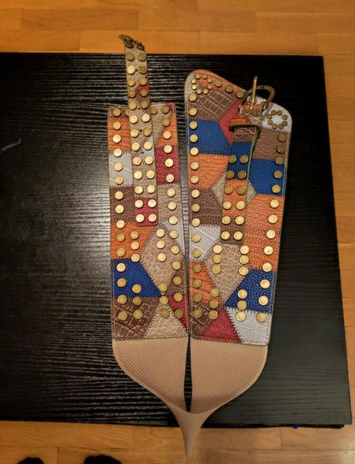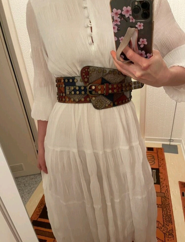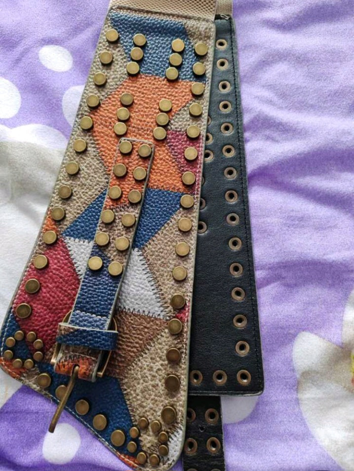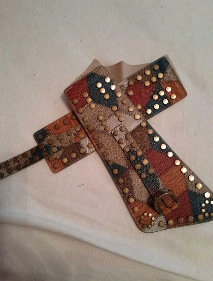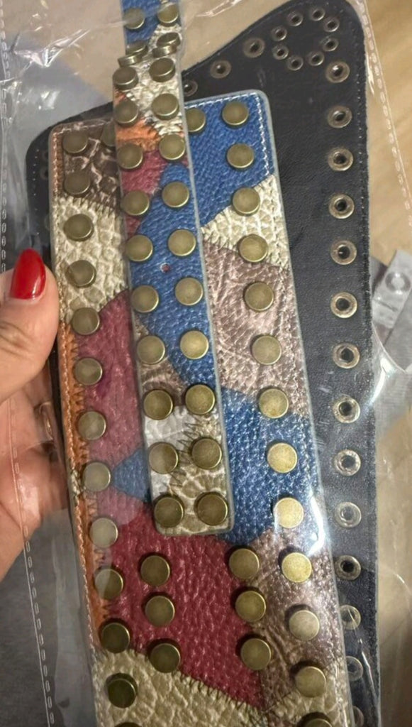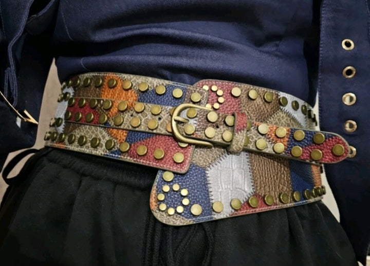Crafted with a unique patchwork of multicolor textures, the belt features bronze stud embellishments and a chunky buckle that give it a vintage yet modern edge. Its wide fit makes it perfect for cinching flowy dresses, oversized shirts, or high-waisted bottoms, instantly creating a flattering hourglass shape.
