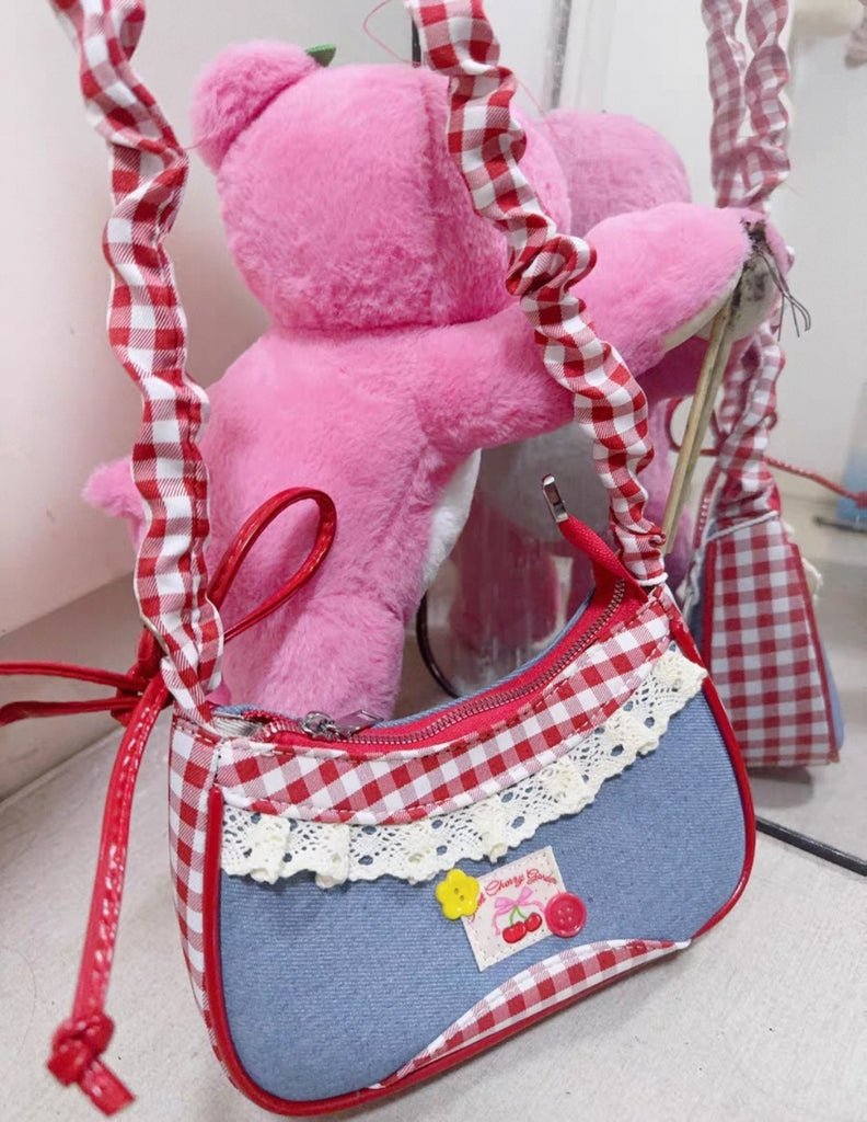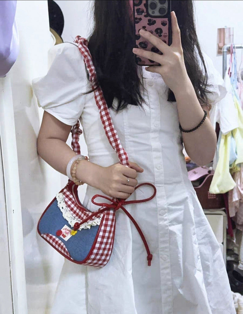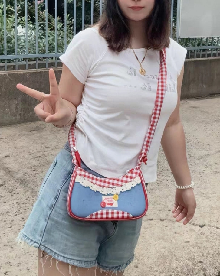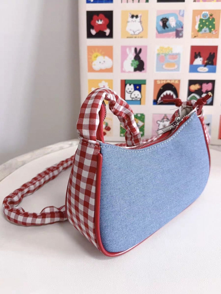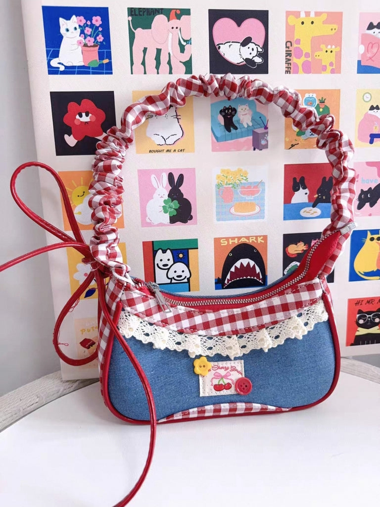 Add a pop of vintage charm to your wardrobe with this retro-inspired patchwork shoulder bag. Featuring a bold gingham strap, denim-style body, and a cute red ribbon detail, this bag is the perfect blend of playful and chic. Its compact size makes it ideal for carrying daily essentials while making a statement.