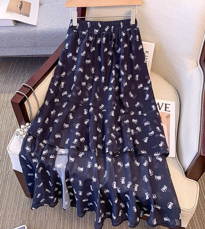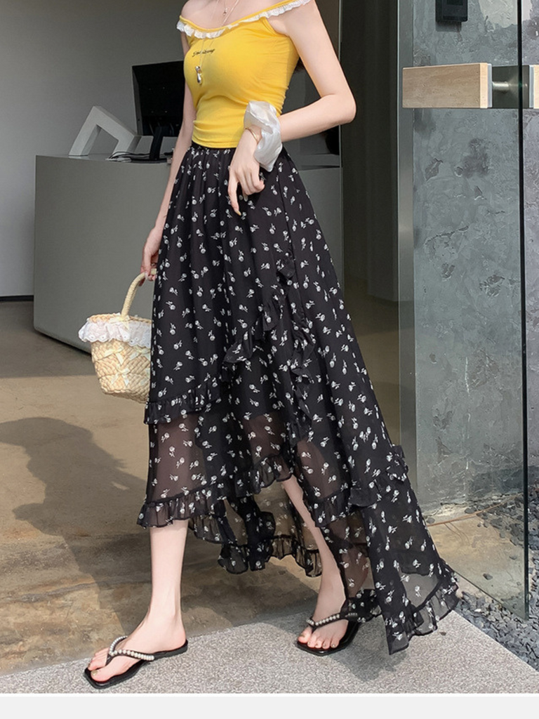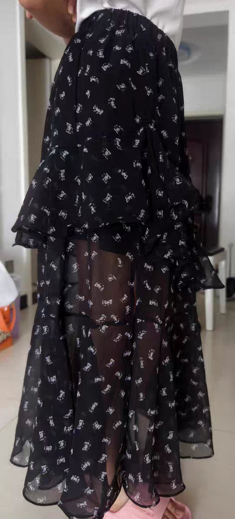 Elevate your wardrobe with this high-waisted black printed skirt featuring a stylish slit for added movement and appeal. Designed to slim and flatter, its mid-length cut offers a balanced silhouette suitable for various occasions. Crafted for comfort and confidence, this skirt pairs effortlessly with both casual and dressy tops, making it a versatile addition to any modern woman's collection.