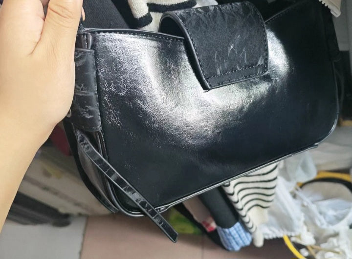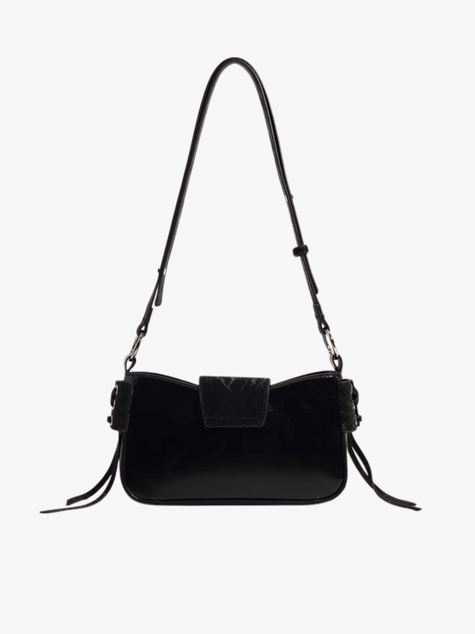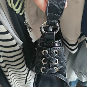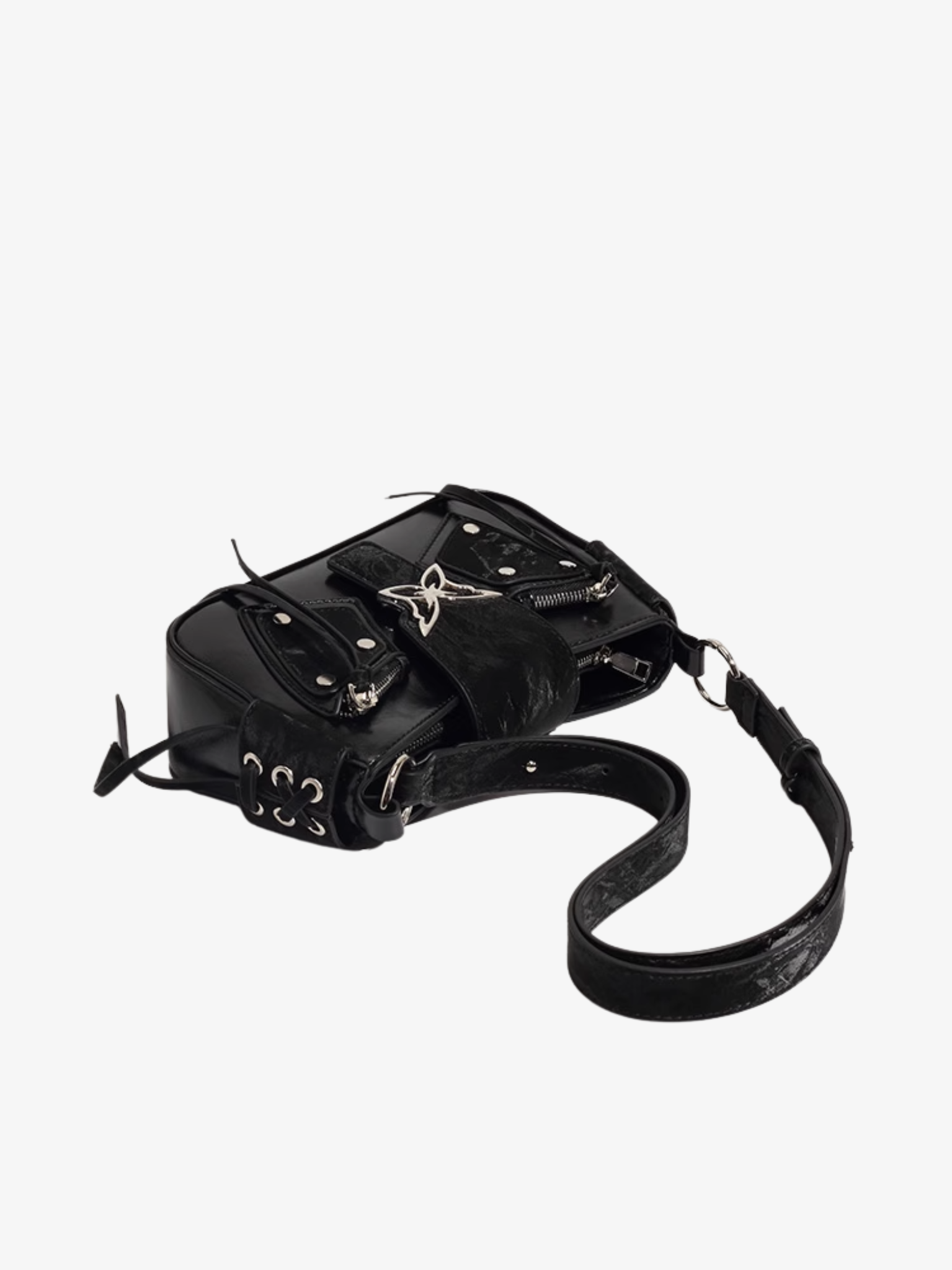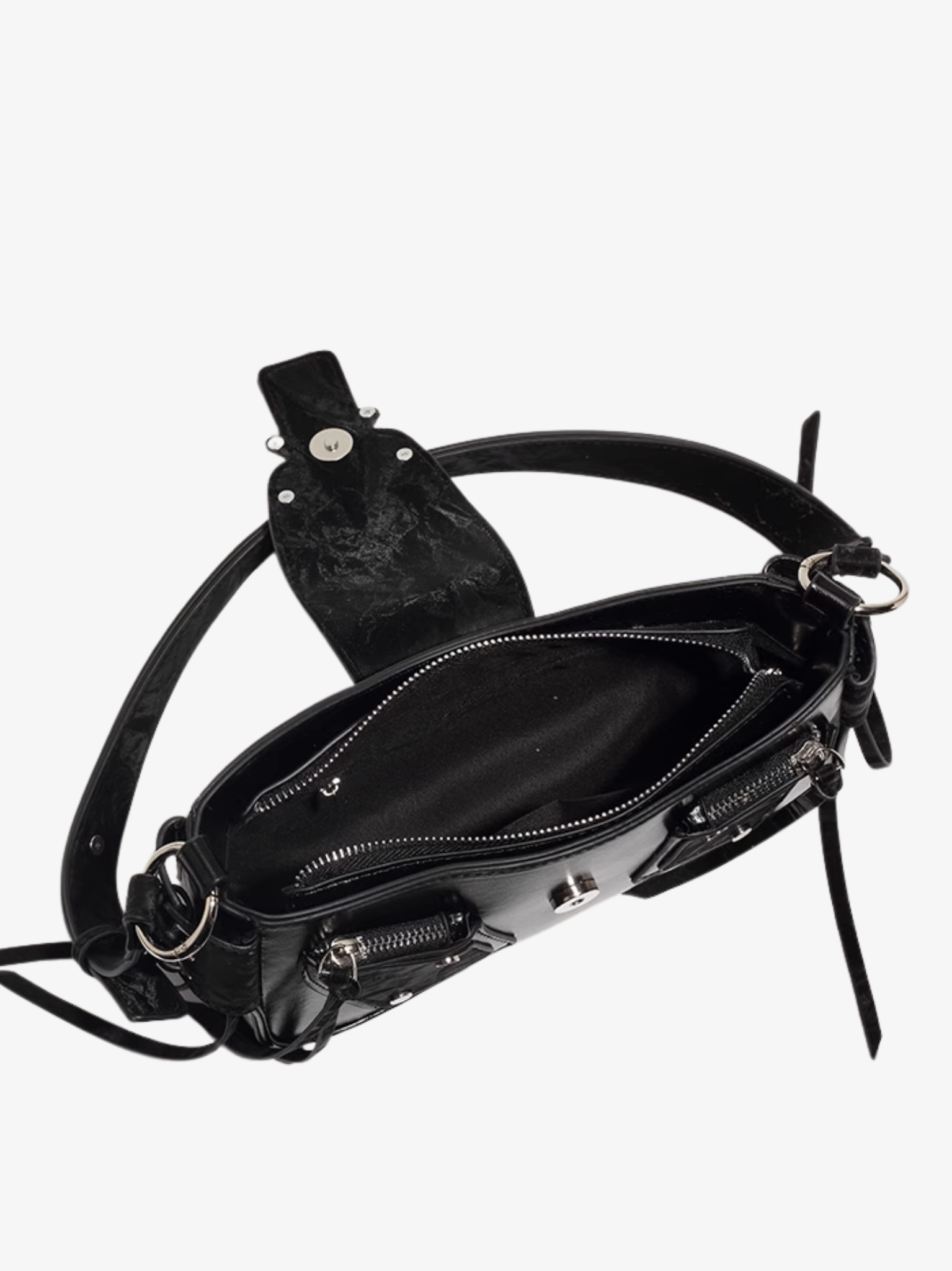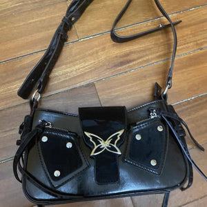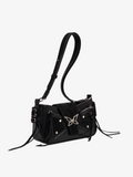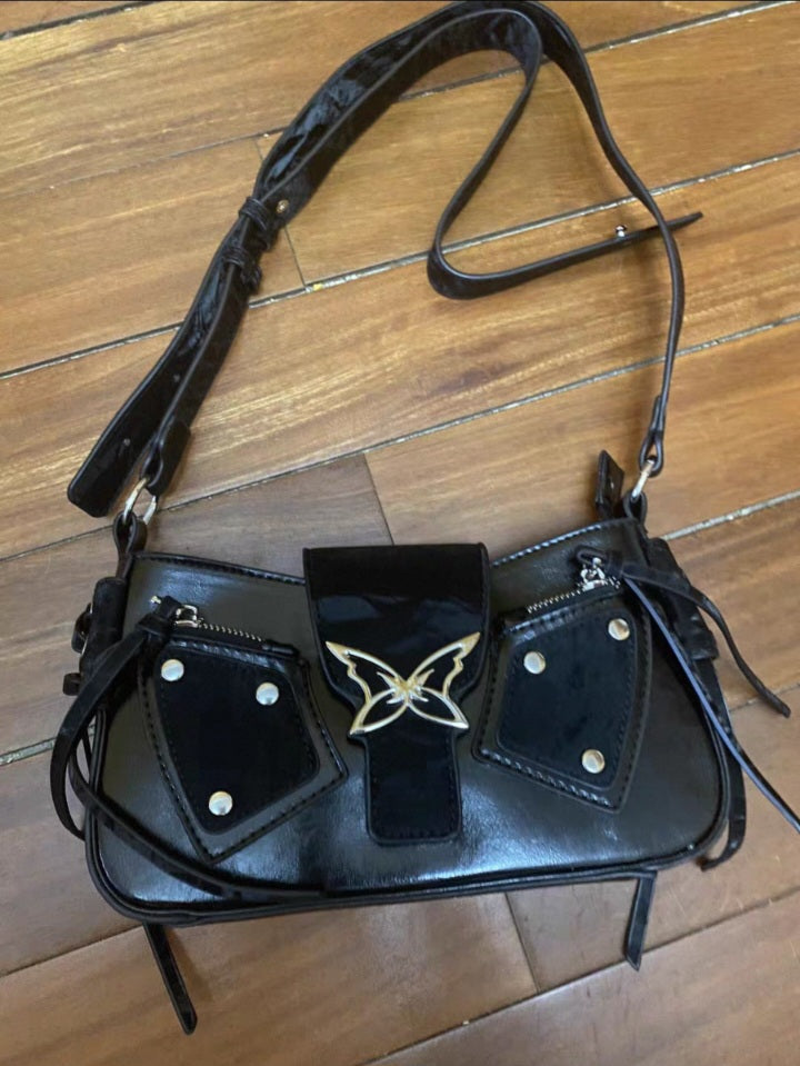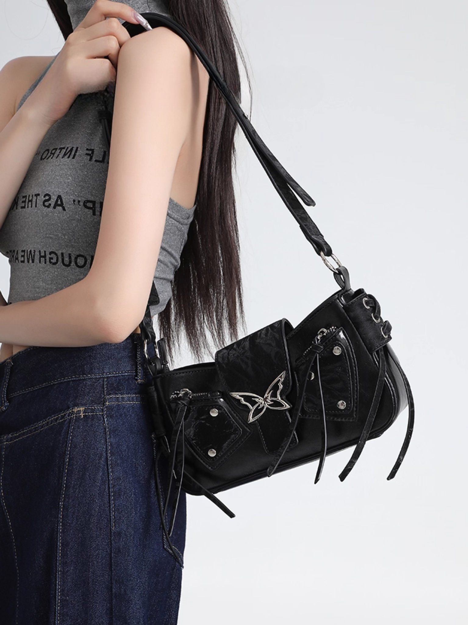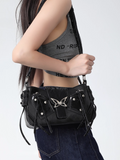 This Y2K-inspired armpit bag for women combines style and functionality with its compact square design and versatile crossbody strap. Featuring a sturdy rivet detail and a charming bow accent, it offers a modern edge while comfortably fitting under the arm for secure daily use. Ideal for commuters, this small bag effectively organizes essentials without sacrificing aesthetic appeal.