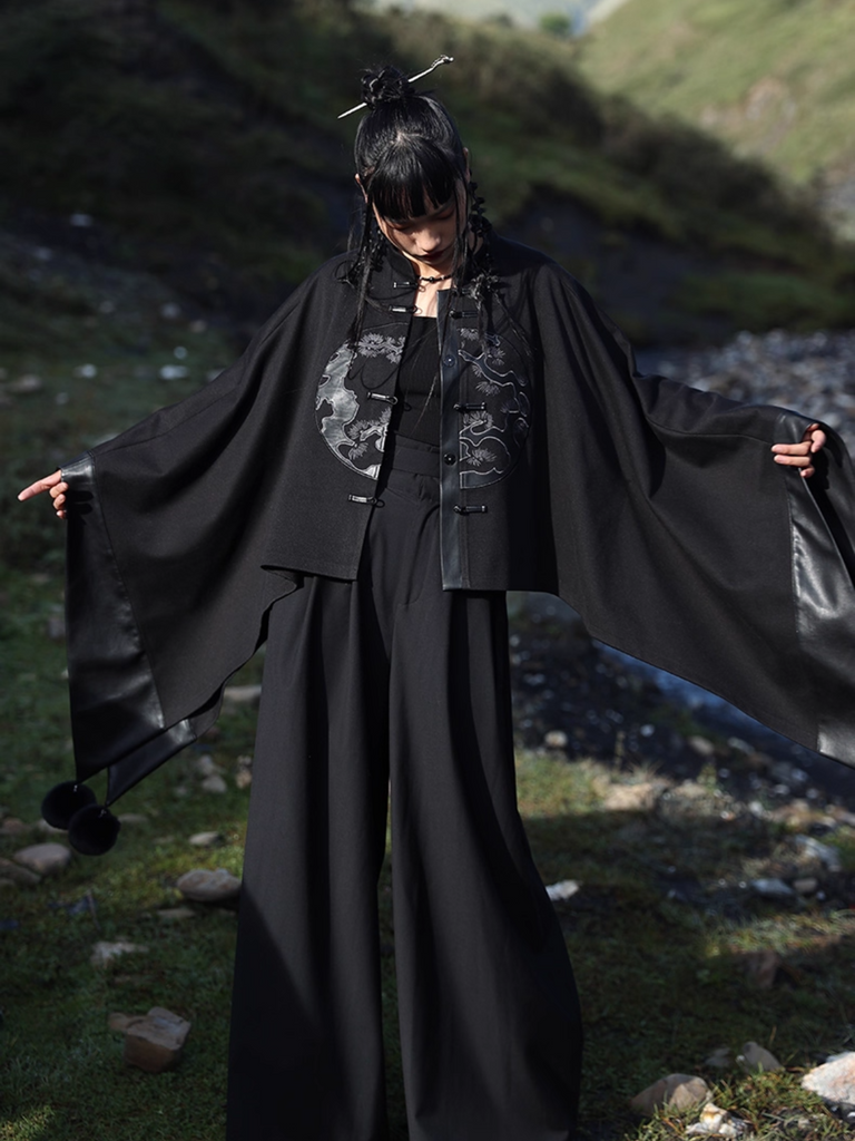 This women's black tweed cloak jacket combines traditional Chinese embroidery with a contemporary irregular cut, offering a distinctive autumn and winter outer layer. Crafted from loose woolen fabric, it provides warmth while maintaining breathability and comfort. Its unique design adds sophistication and versatility, perfect for elevating your seasonal wardrobe with expert craftsmanship and style.