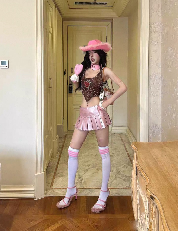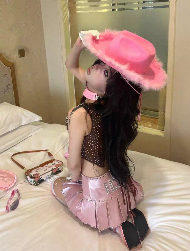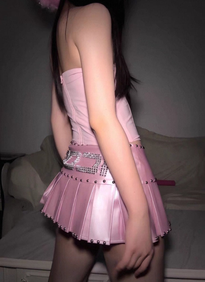 Elevate your look with this edgy yet playful pleated pink mini skirt. Designed in a glossy faux leather finish, it features bold silver studs along the waistline and hem for a punk-inspired twist. The standout detail is the sparkling rhinestone "ICON" lettering across the front, making this skirt the ultimate statement piece. Its structured pleats add movement and volume, while the mini length creates a flattering, leg-lengthening effect.