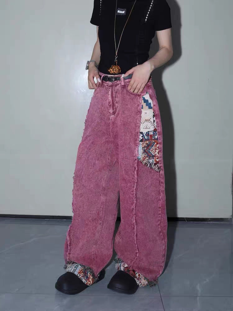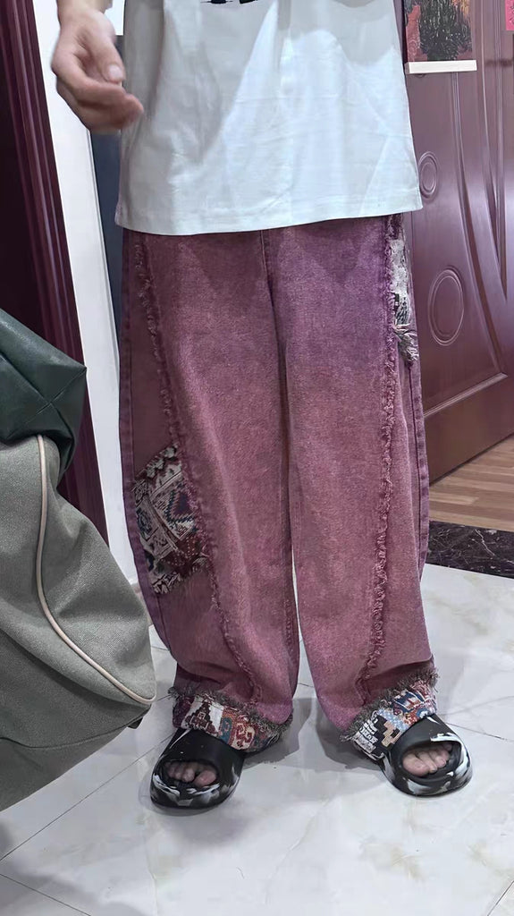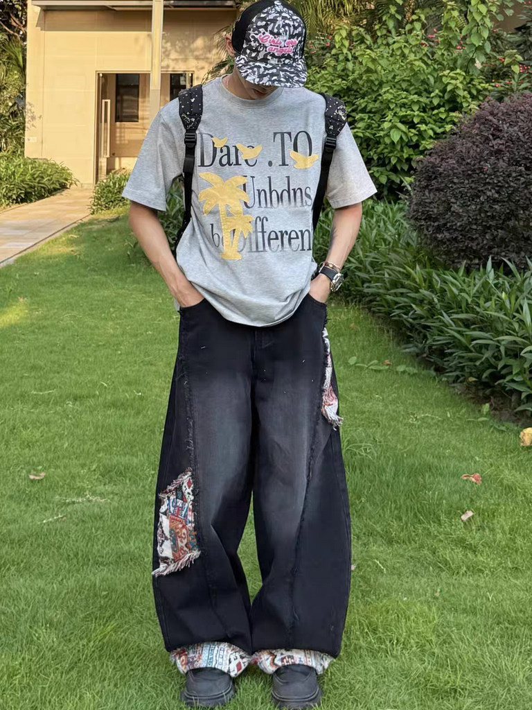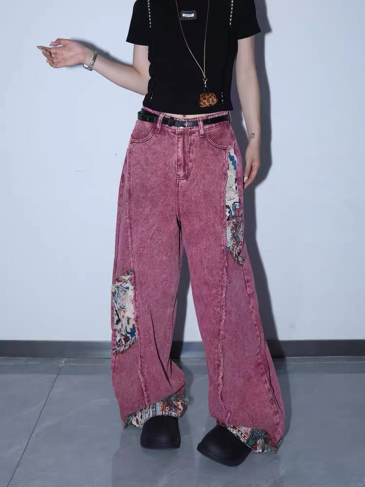 Stand out in these unisex wide-leg jeans featuring bold distressed patchwork and unique scimitar embroidery. With a vintage American flair, these pants blend streetwear attitude with creative detailing.