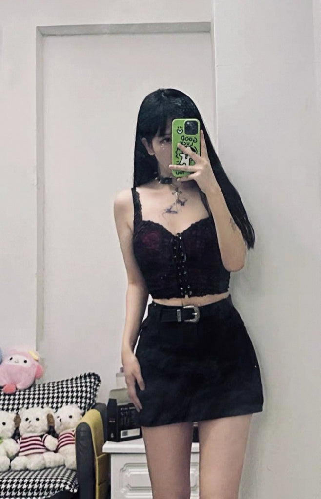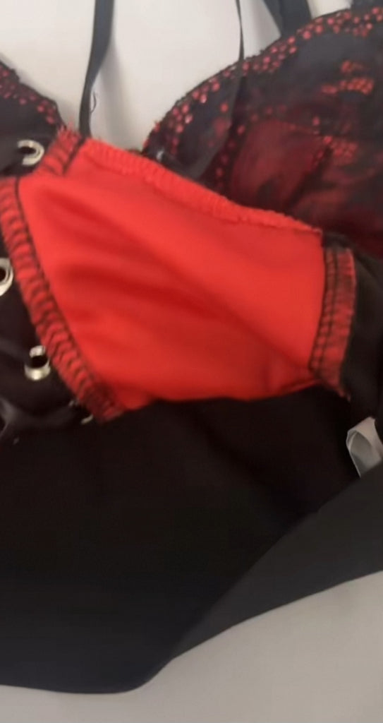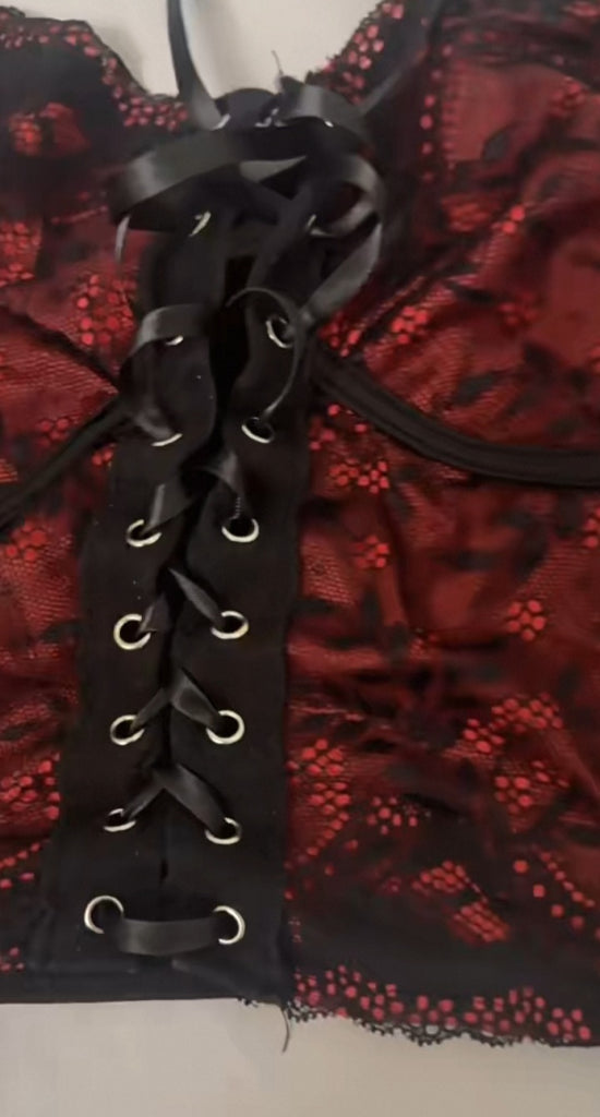 Turn heads with this black and red lace corset bustier top, blending elegance with seductive edge. Designed with delicate floral lace overlay, sheer mesh panels, and a lace-up front, this top flatters your figure while adding a daring vibe to any outfit. The adjustable straps and structured cups provide support, while the cropped silhouette makes it easy to pair with high-waisted jeans, skirts, or leather pants.