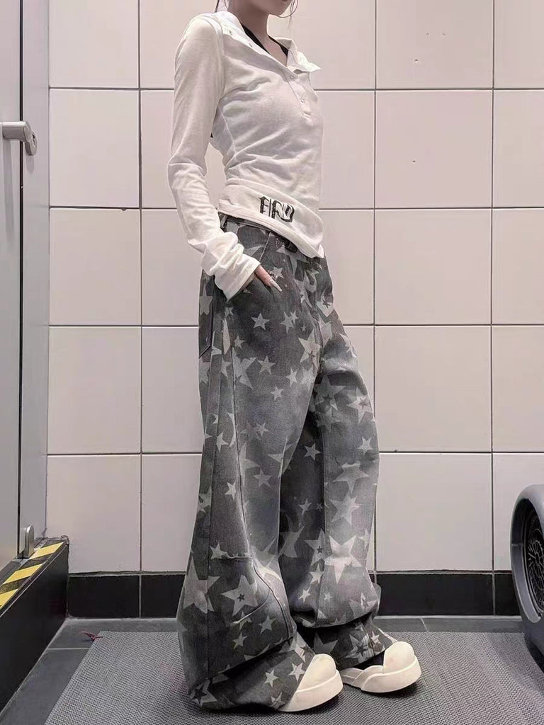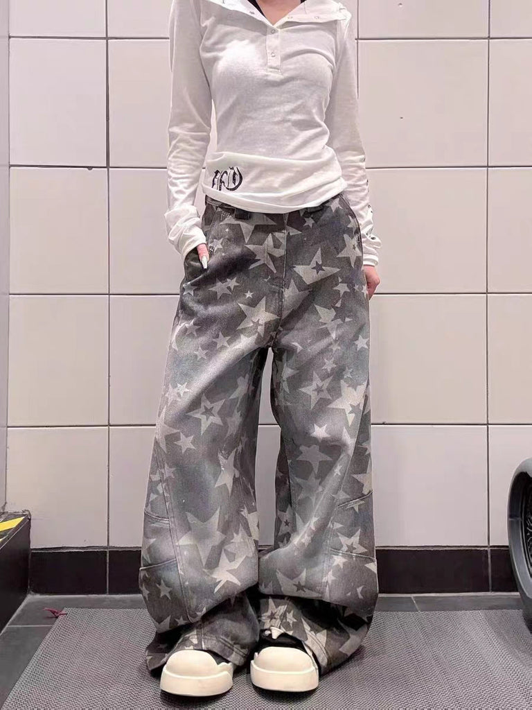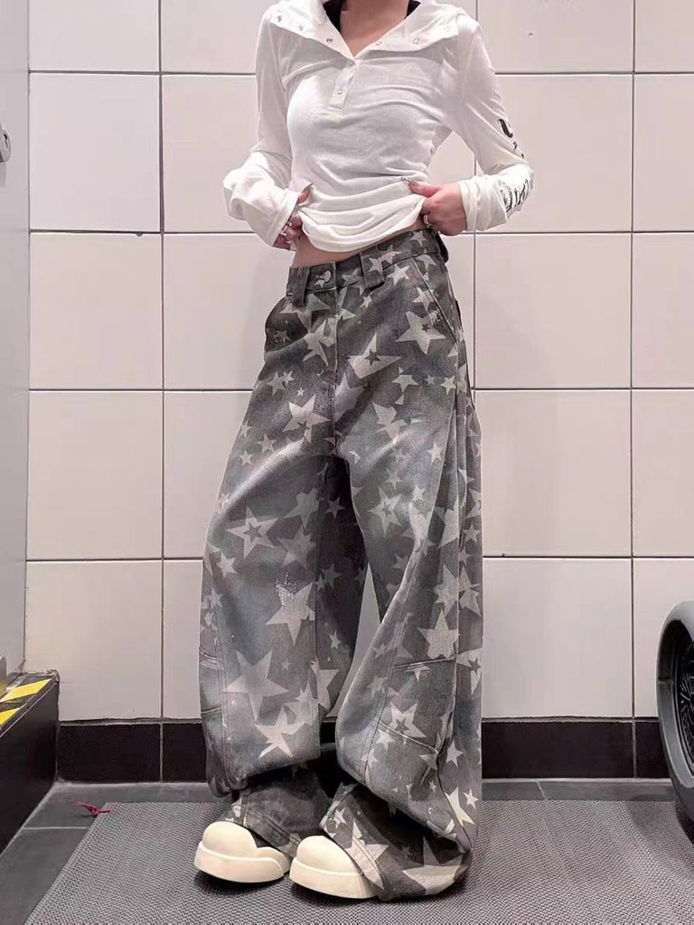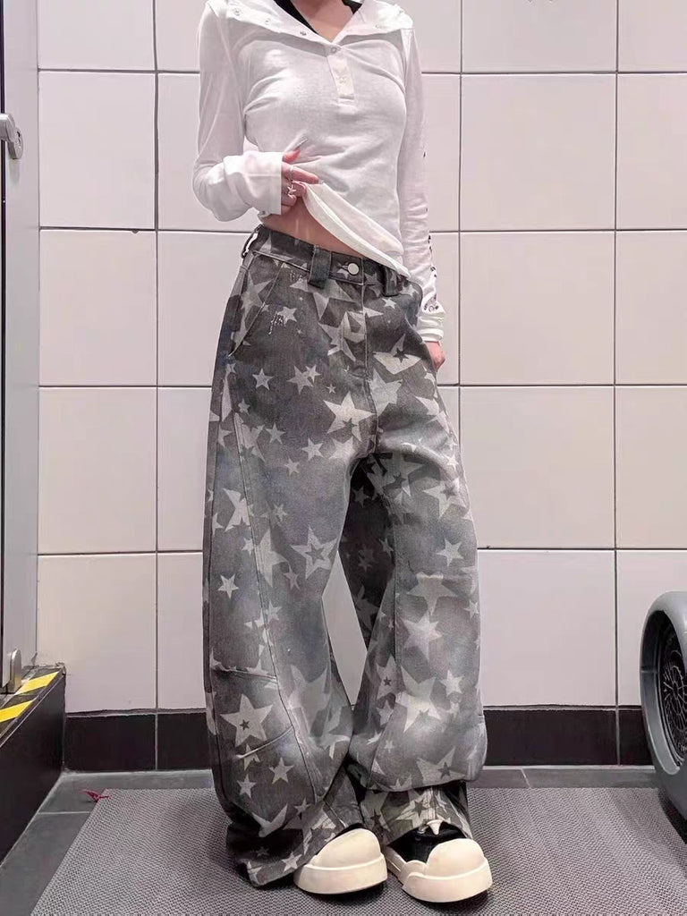 Stand out from the crowd with these star print baggy jeans, designed for a bold and modern streetwear look. Crafted from durable washed denim, they feature an all-over star pattern that gives off a playful yet edgy vibe. The oversized wide-leg silhouette ensures maximum comfort while delivering that relaxed, fashion-forward fit loved in urban culture.