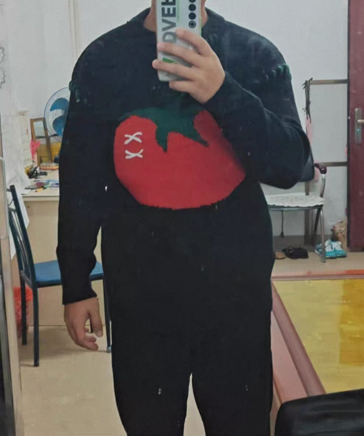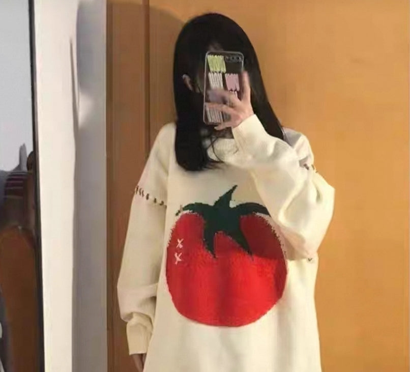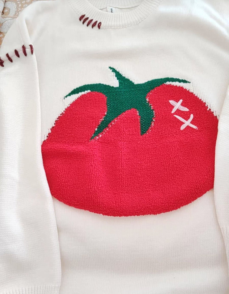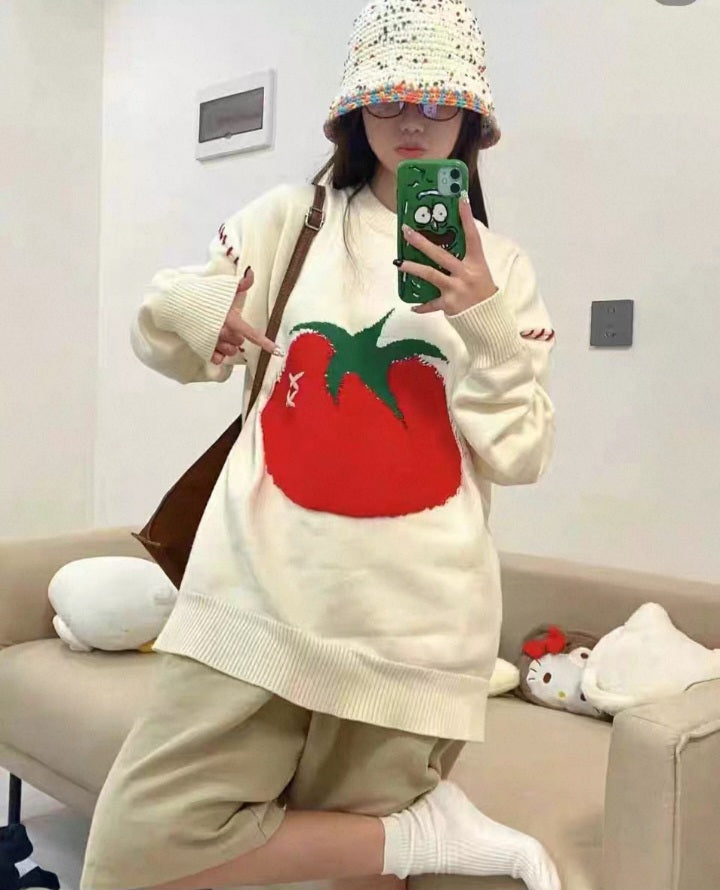 Elevate your autumn wardrobe with this knitwear sweater, designed with a distinctive tomato-inspired motif. Expertly crafted for couples, its round neck and refined knit ensure comfort and style in cooler seasons. This unique piece combines artistic design with premium quality, making it a sophisticated choice for those who appreciate both fashion and seasonal elegance.