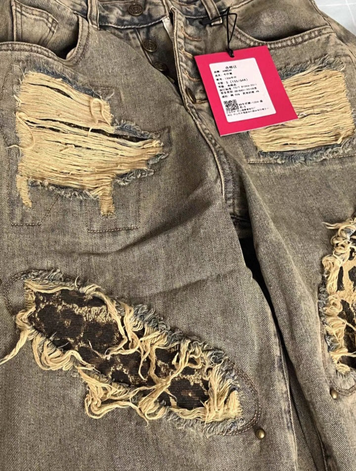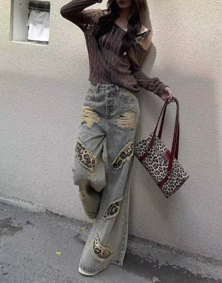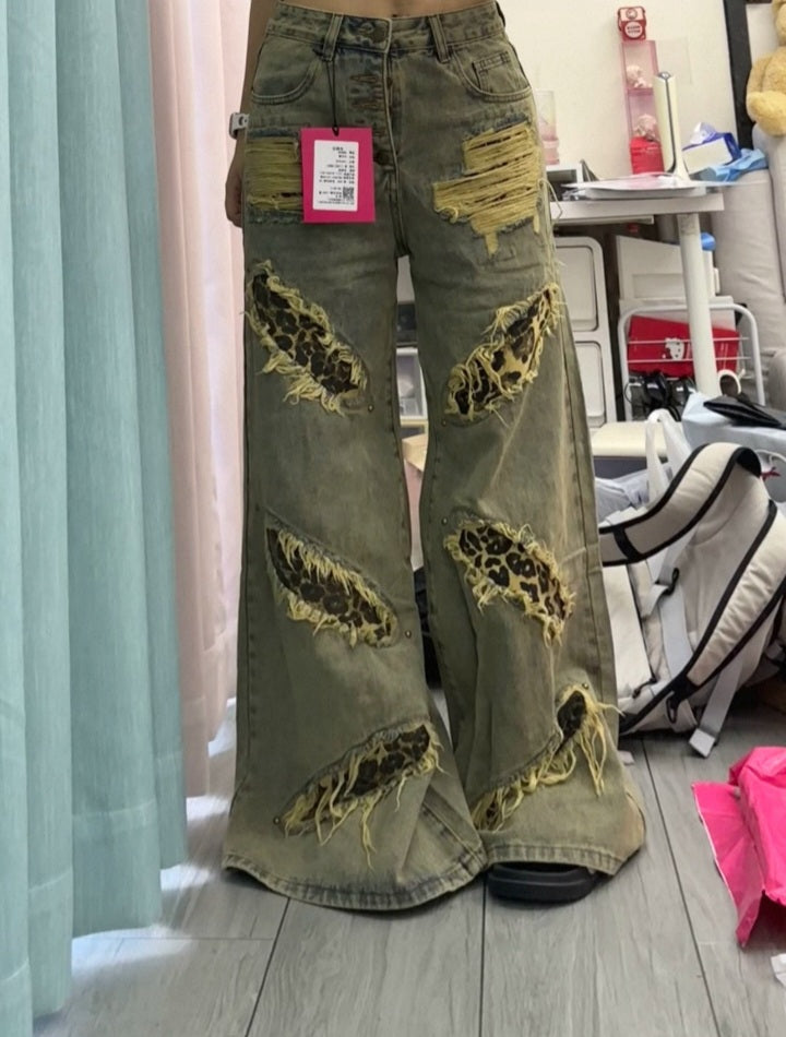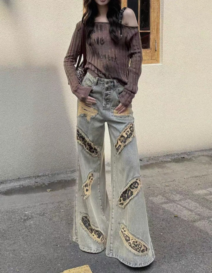 Unleash your bold side with these vintage inspired wide-leg jeans, designed for those who love edgy streetwear with a wild twist. Featuring distressed ripped patches layered with leopard print fabric, these jeans combine rugged denim with fierce animal print accents. The high waist fit and wide leg cut create a flattering silhouette, perfect for pairing with crop tops, oversized shirts, or edgy jackets. Whether styled for casual outings, festivals, or nightwear fashion, these jeans bring a unique retro-grunge vibe that stands out effortlessly.